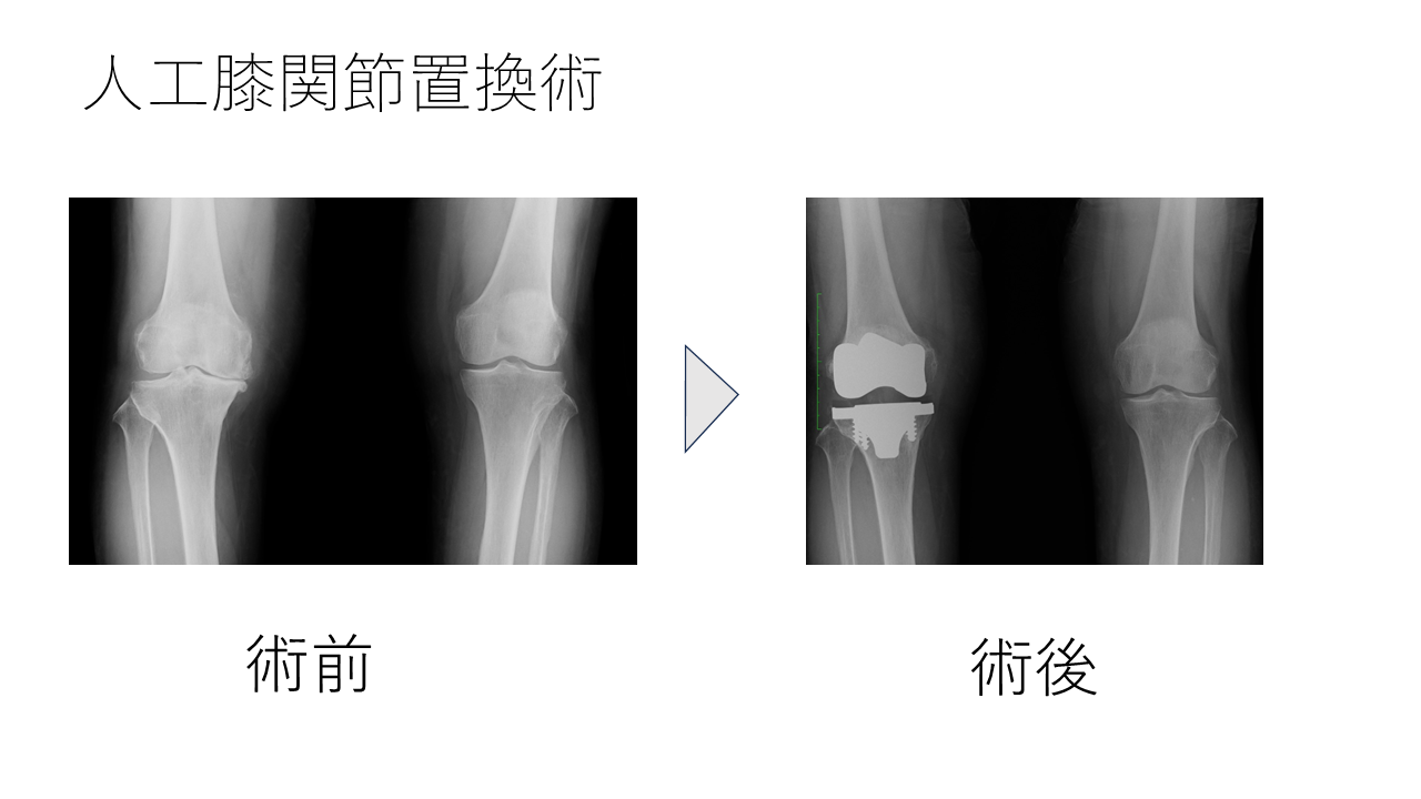 当院に来院された際、半年前から左の股関節(こかんせつ)の痛み、3年前から右の膝関節(ひざかんせつ)、1年前から左の膝関節の痛み症状あり。 他の医療機関で注射や痛み止め、湿布の治療を受けていたものの、徐々に痛みが悪化し、当院に受診されました。 診察にて左股関節と右膝関節の可動域制限(動きの悪さ)と可動時痛(動かした際の痛み)、レントゲン写真にて関節の著明な変形を認め、左変形性股関節症と右変形性膝関節症の診断となりました。