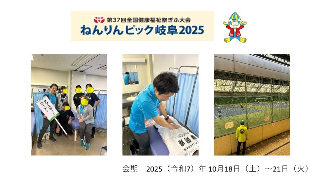 岐阜県理学療法士会から他院のスタッフを合わせて6名が参加。主にテニス競技参加者の競技前のコンディショニング、テーピング、競技後のアイシング、ケア等を実施、約30名の選手の対応をしました。